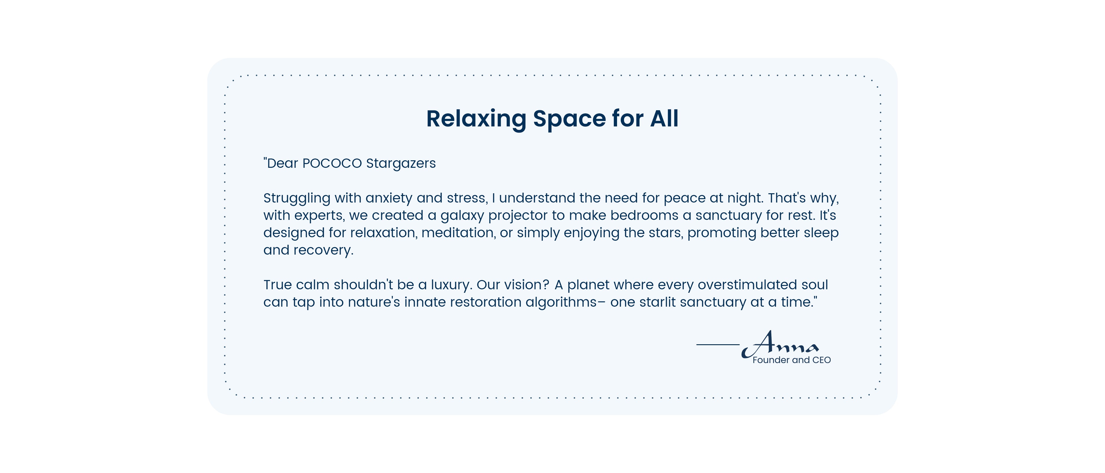 Imagine if we could all sleep soundly after complete relaxation - the world would become a brighter place. Our dream is to create captivating galaxy projectors to unlock a world full of rest and tranquility."